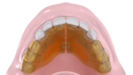 Appareil en résine en forme de tunnel dans lequel la langue doit se placer, fixé à la mâchoire supérieure par des crochets métalliques.